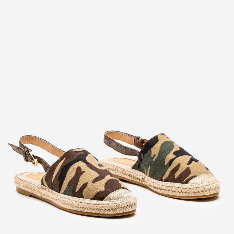 - Espadrilles extrêmement confortables en tissu camouflage. Rayure en daim écologique, décorée d'un motif animalier. Semelle intérieure recouverte de tissu. La semelle et la pointe de la chaussure sont finies avec un cordon de jute tressé.