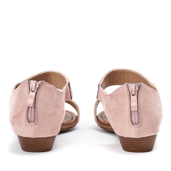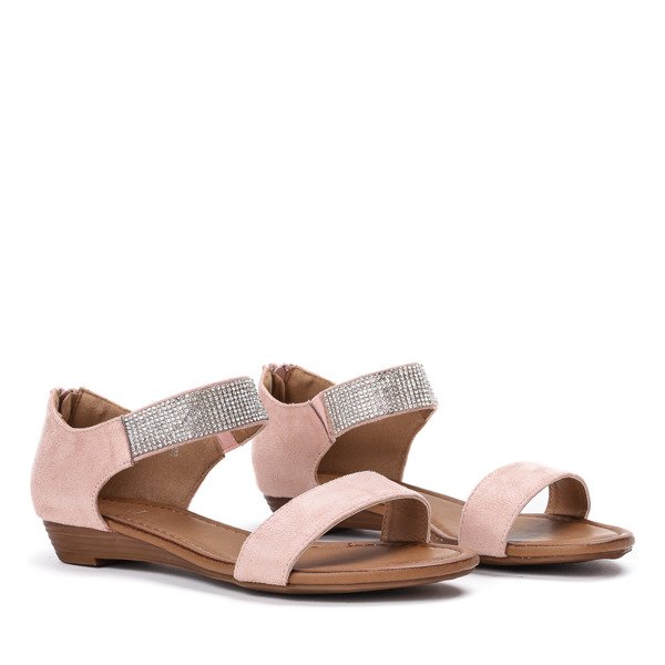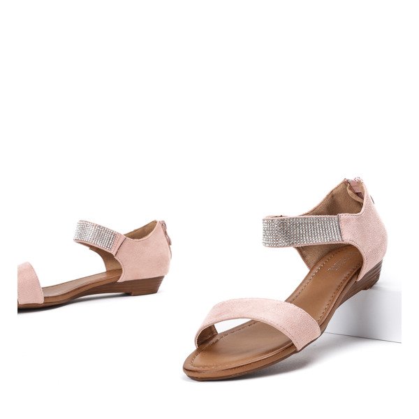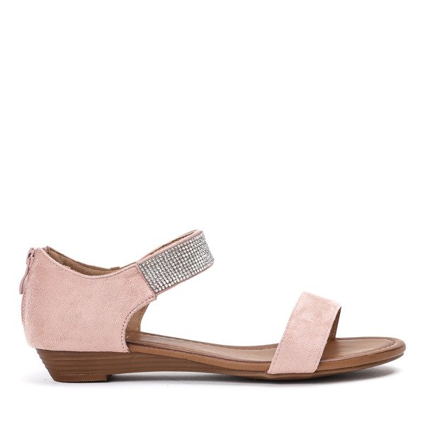 - Różowe sandały wykonane ze skóry ekologicznej zamszowej. Model na niskiej koturnie. Paseczek na wysokości kostki zdobiony cyrkoniami. Obuwie damskie posiada zapięcie na suwak w tylnej części.