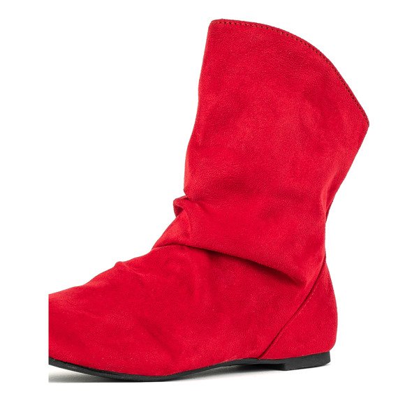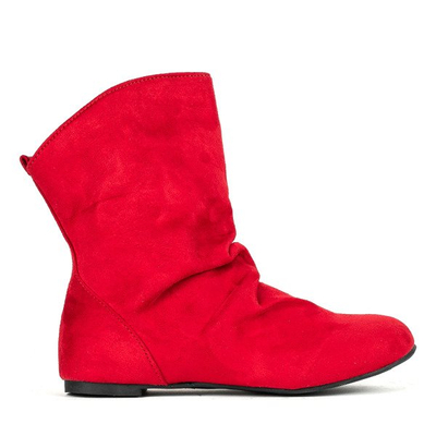 - Botki na płaskim obcasie z okrągłym noskiem. Materiał wykonania to ekologiczna skóra zamszowa w czerwonym kolorze. Wkładka buta pokryta eko-skórą. Prezentowane obuwie damskie posiada marszczenie w przedniej części cholewki. Buty pasują do wielu kreacji!