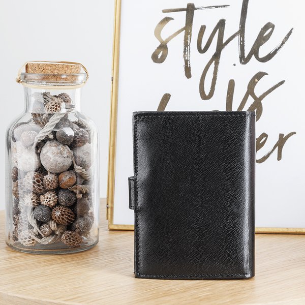 - Petit portefeuille homme en cuir écologique, fermé par un bouton. Le portefeuille a 2 grands compartiments, 10 poches de différentes tailles et une place pour les pièces de monnaie.
