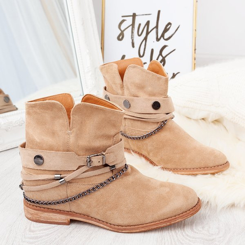 - Bottines style cowboy à talon compensé couvert. Le matériau est en éco-suède de couleur beige. L'intérieur de la chaussure est isolé avec de la fourrure. Les chaussures ont des décorations qui peuvent être enlevées. Parfait pour la garde-robe de tous les