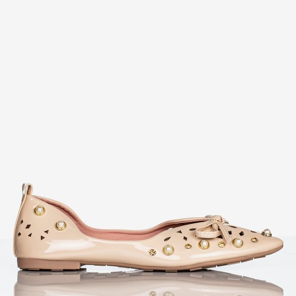 • Ballerines femme beige avec nez pointu. La tige a des découpes et des ornements en forme de zircons et de perles. Le milieu de la chaussure est en éco-cuir. Les chaussures pour femmes présentées sont parfaites pour des stylisations élégantes.