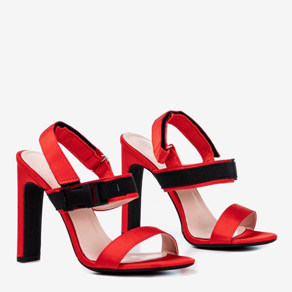 - Sandales femme sur tige rectangulaire rouge. Le modèle est en cuir écologique recouvert d'un tissu satiné. Les chaussures sont fermées avec une boucle et une boucle.