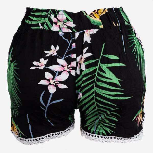 - Short court noir pour femmes avec une taille élastique extensible. Reliure décorative sur le caoutchouc. Pantalon en tissu, décoré de fleurs et de dentelle. REMARQUE: Précision de mesure (+/-) 1 cm.