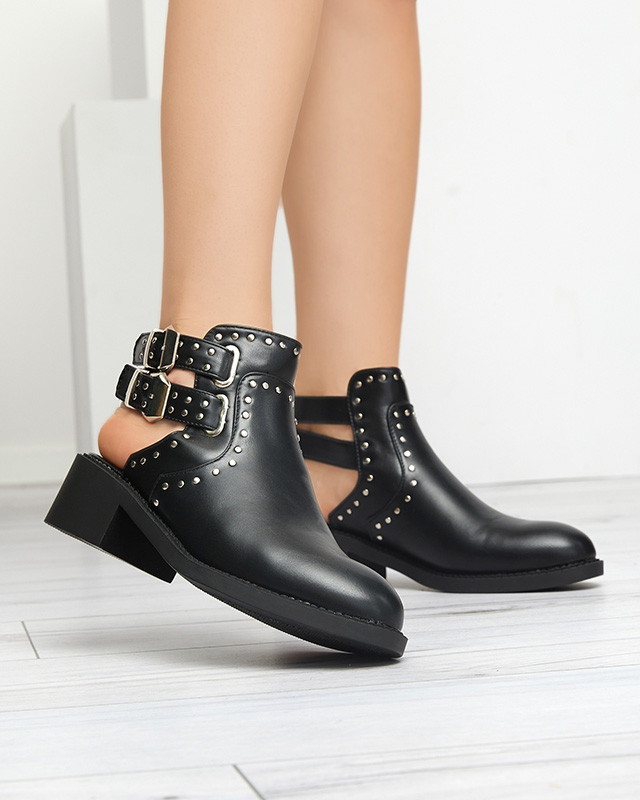 - Bottes pour femmes noires avec découpes en cuir écologique. Modèle à talons bas, fermés par des boucles dans le dos. La tige est ornée de jets argentés. Accessoire parfait pour une veste et une robe en cuir!