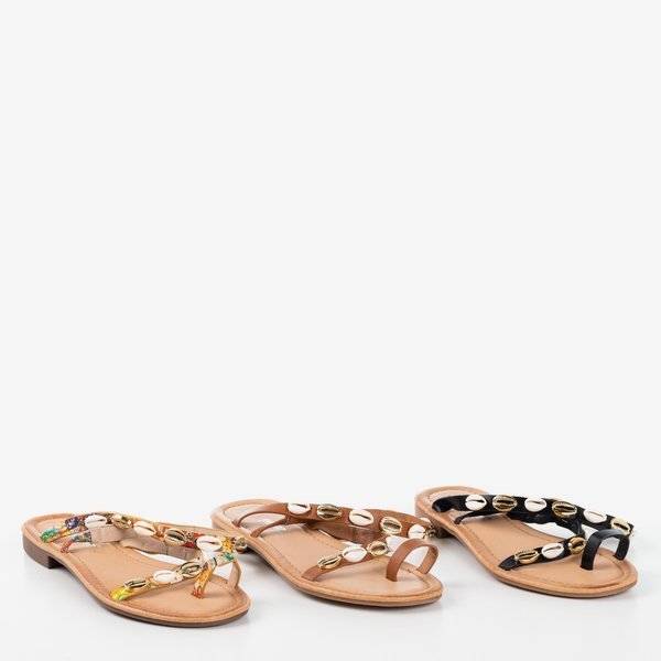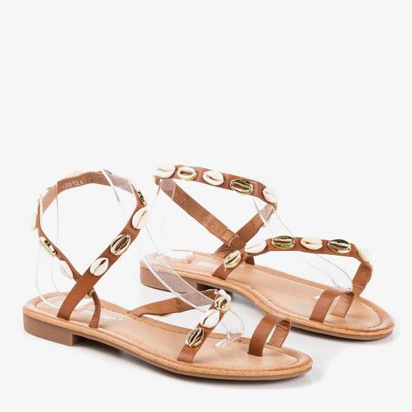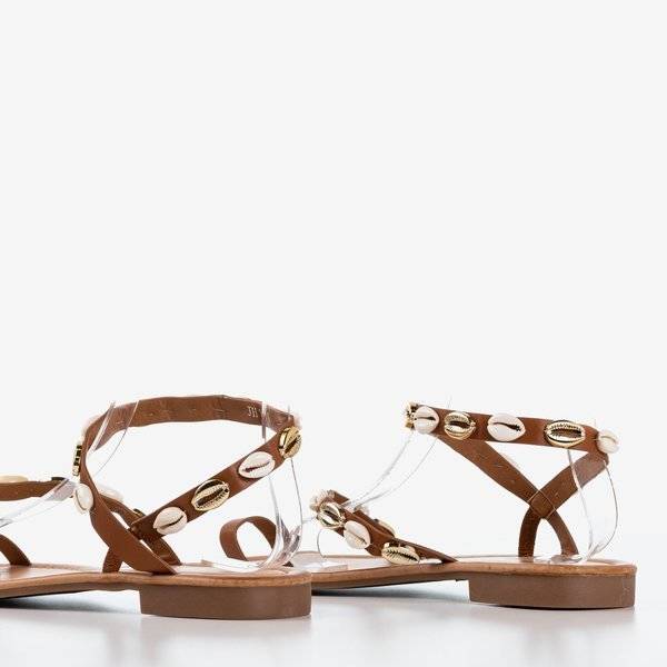 • Sandales femme originales à talons plats. Fabriqué en cuir écologique marron. De fines rayures sont décorées de coquilles dorées et blanches. Un ajout élégant aux robes d'été.