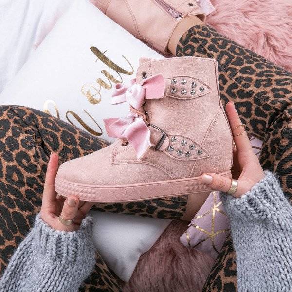 - Baskets plates roses à talon compensé recouvert. Fabriqué en peau de chamois écologique, la tige est fermée par une fermeture éclair sur le côté et lacée. Chaussures décorées de jets et de boucles. Parfait pour les pantalons et la veste de motard en cuir.
