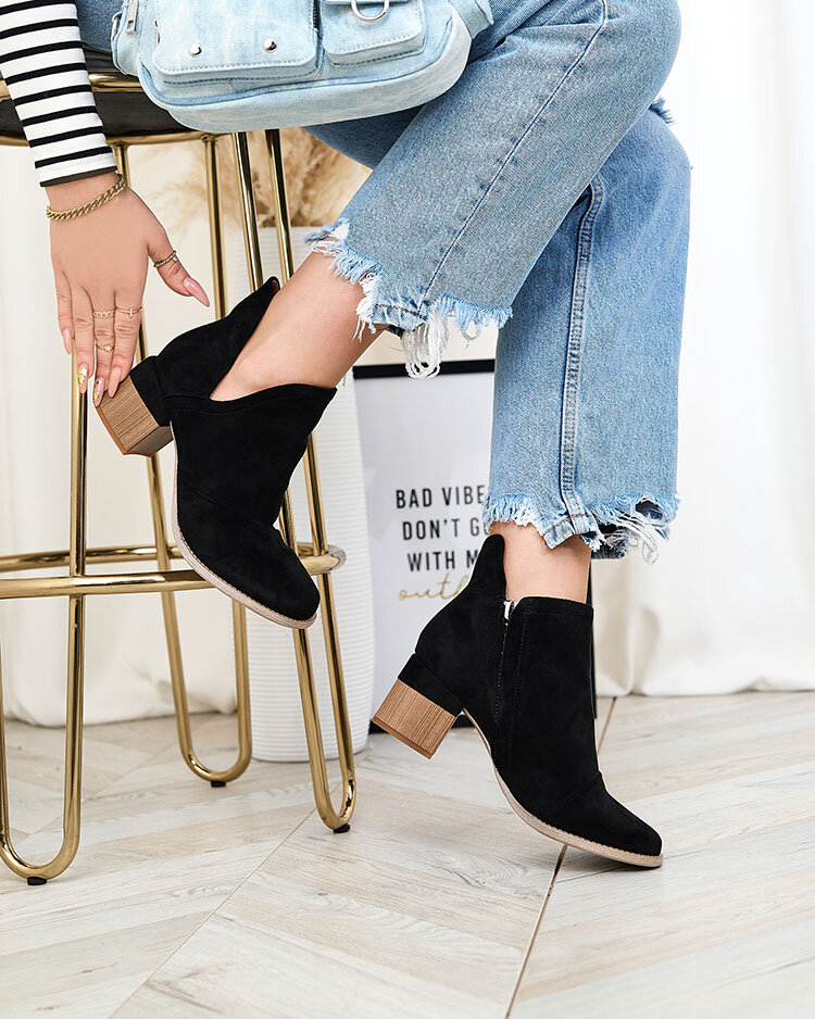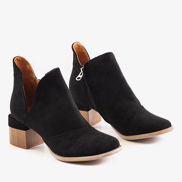 - Bottines femme tendance avec découpes sur le montant bas. La tige est en éco-suède noir et la semelle intérieure est recouverte de tissu. Le modèle est fermé par une fermeture éclair à l'intérieur. Se fondre parfaitement dans n'importe quel style de tous