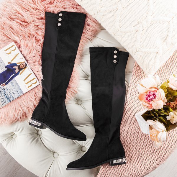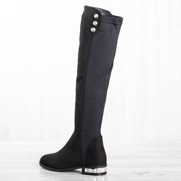 - Bottes élégantes à talons plats à bout rond. La tige est faite de suède écologique et d'un matériau flexible. La partie avant de la chaussure et la partie inférieure sont isolées avec de la fourrure. Fermeture zippée. Les bottes sont décorées de belles pi