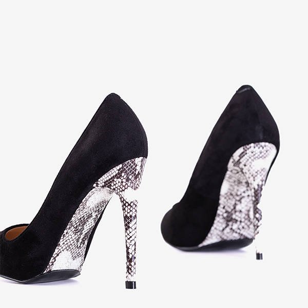 - Escarpins classiques sur un talon, en peau de chamois éco-cuir. La pointe de l'orteil allonge et amincit les jambes, semelle intérieure en éco-cuir à l'intérieur. Le talon est décoré de peau de serpent a'la en relief animal. Ils sont parfaits pour les sty