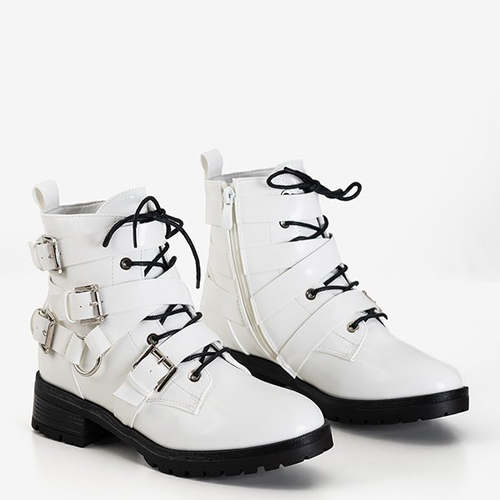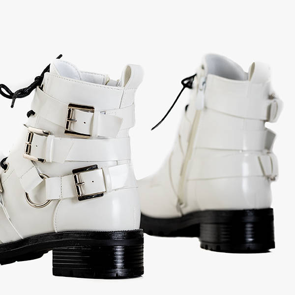 - Bottes à talons plats pour femmes dans le style des travailleurs. La tige est en cuir écologique blanc et décorée de rayures avec des boucles. Chaussures à lacets avec fermetures éclair. Le modèle est isolé avec une fourrure délicate.