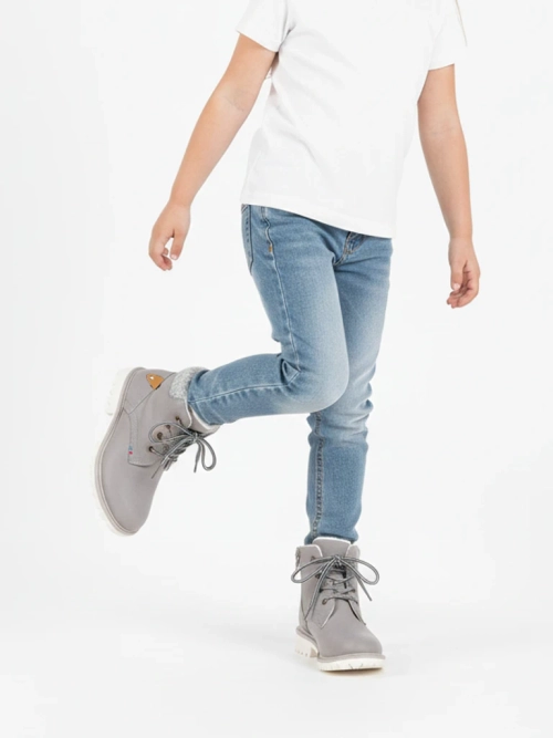 - Bottes de randonnée confortables pour enfants en cuir écologique. L'intérieur est isolé avec un manteau en peau de mouton. Les chaussures sont lacées et fermées par une fermeture éclair sur le côté. Ils sont parfaits pour les froides journées d'hiver.