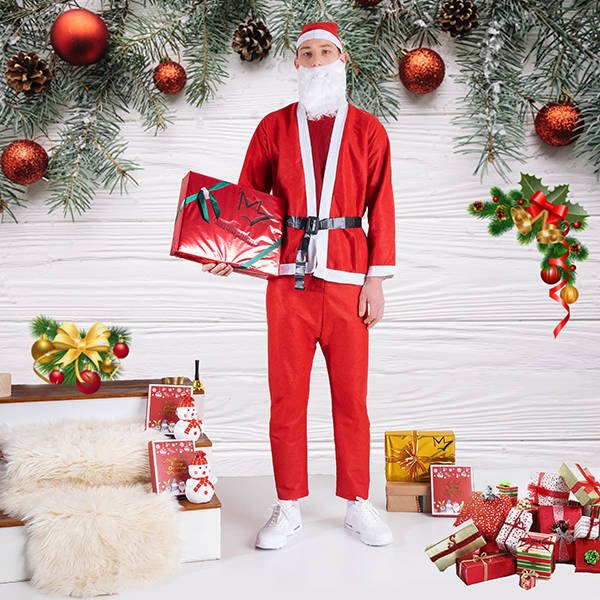 • Hommes St. Nicholas, en tissu rouge. L'ensemble comprend: un sweat-shirt, un pantalon - avec un passepoil, un chapeau avec de la fourrure et un pompon, une barbe et une ceinture avec une boucle. REMARQUE: Précision de mesure (+/-) 1 cm.