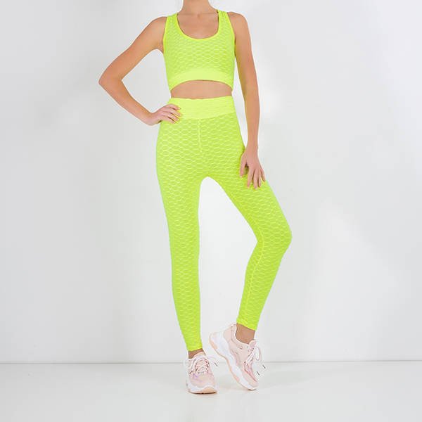 • Ensemble de sport pour femme en tissu extensible. Soutien-gorge sans doublure et poches pour inserts. Bande élastique en bas. Legging d'entraînement taille haute avec large bord côte à la taille. REMARQUE: Précision de mesure (+/-) 1 cm.