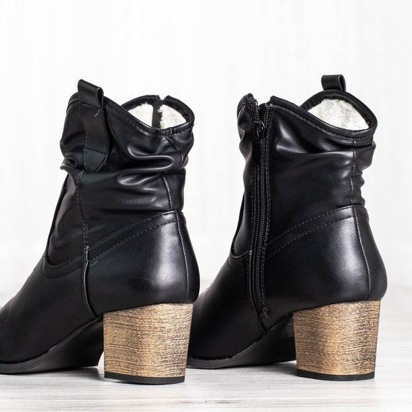 - Bottes de cowboy pour femmes incroyablement confortables sur un poteau en bois. La tige est en cuir écologique noir. Ils ont une isolation en fourrure à l'intérieur. Remarque: la semelle a une semelle fissurée.
