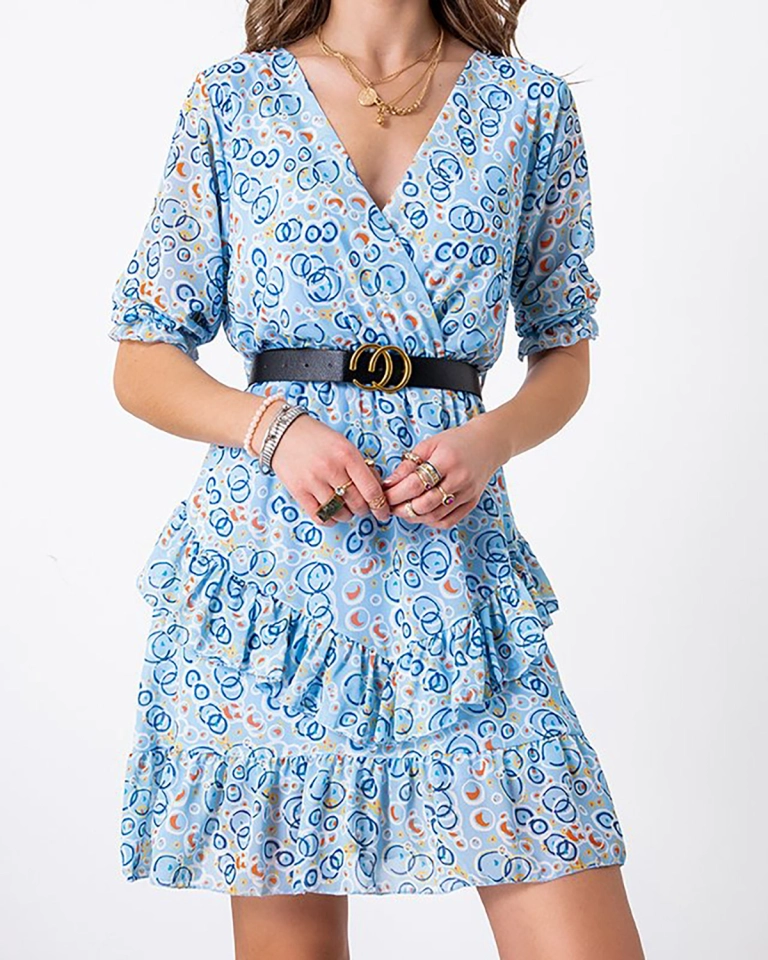 - Robe pour femme à la mode avec une longueur mini, en tissu léger avec des motifs. Modèle avec un décolleté enveloppe et un bas évasé orné de volants. Manches 3/4, une ceinture est attachée au produit. REMARQUE: Précision de mesure (+/-) 1 cm.