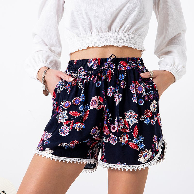 - Short d'été léger pour femme à fleurs, décoré de dentelle blanche. Le modèle est en tissu viscose, possède deux poches et une ceinture élastique. Parfait pour l'été! REMARQUE: Précision de mesure (+/-) 1 cm.