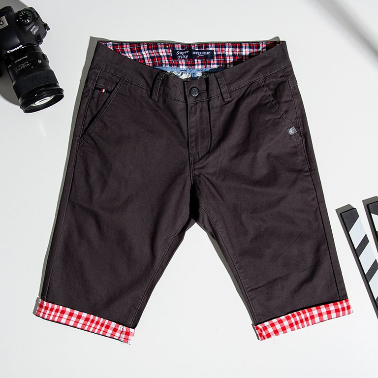 - Short court pour homme, au genou, en tissu de coton doux. Modèle avec taille basse, jambes retroussées et 4 poches. REMARQUE: Précision de mesure (+/-) 1 cm.