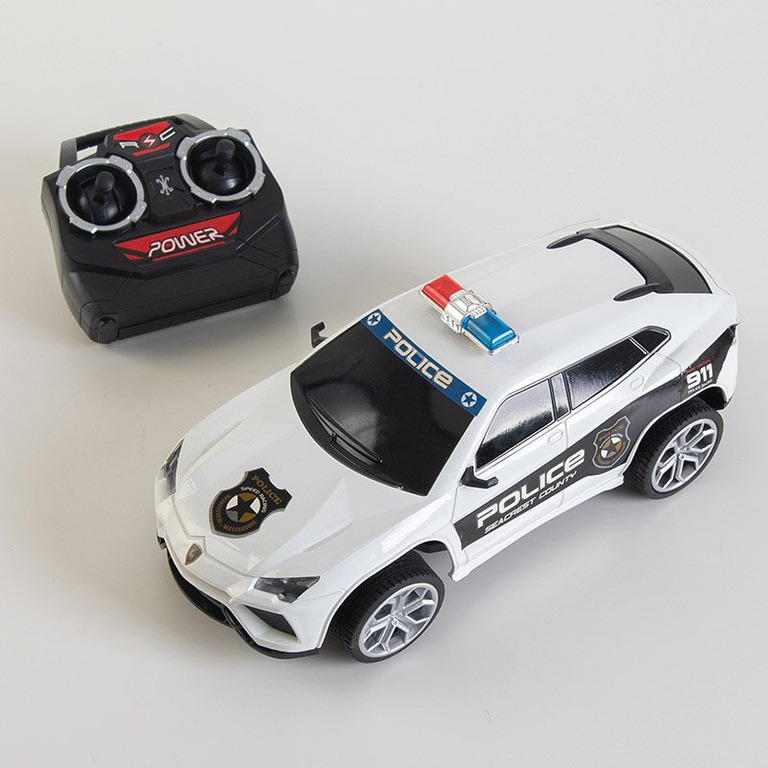 • Une maquette pour enfants d'une voiture de police, contrôlée par une télécommande. La voiture est en plastique dur et a des effets d'éclairage. Nécessite: 4 piles AA de 1,5 V (non incluses). Dimensions du colis: 31,5 x 17 x 13 cm.