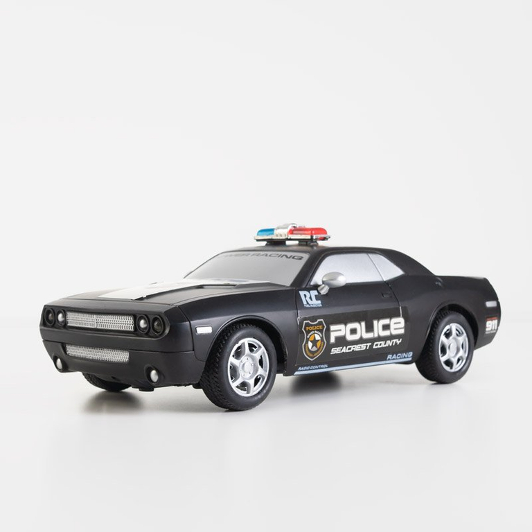 - Une maquette pour enfants d'une voiture de police, contrôlée par une télécommande. La voiture est en plastique dur et a des effets d'éclairage. Nécessite: 4 piles AA de 1,5 V (non incluses). Dimensions du colis: 31,5 x 17 x 13 cm.