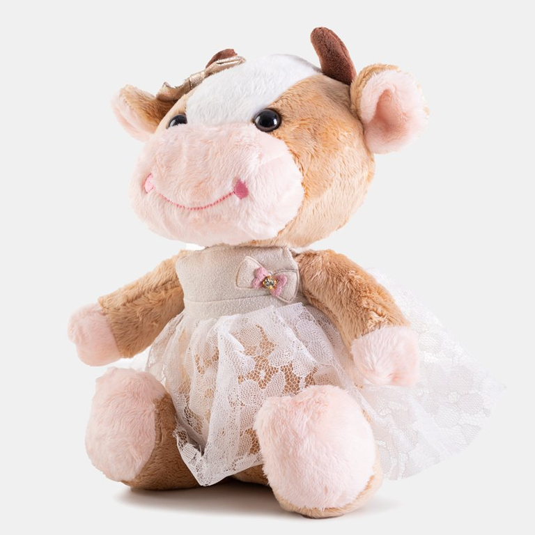 • Joli jouet de bébé vache, fait de fourrure délicate et douce. La mascotte porte une jolie robe. Idée cadeau fantastique. Dimensions : hauteur - 31 cm, largeur - 15 cm.