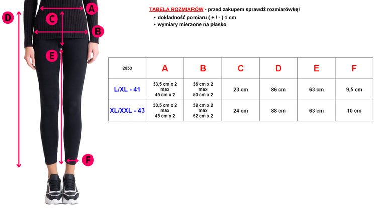 [A] Szerokość w pasie (cm)[B] Szerokość w biodrach (cm)[C] Wysokość stanu (cm)[D] Długość całkowita (cm)[E] Wewnętrzna długość nogawki (cm)[F] Szerokość nogawki na dole (cm)