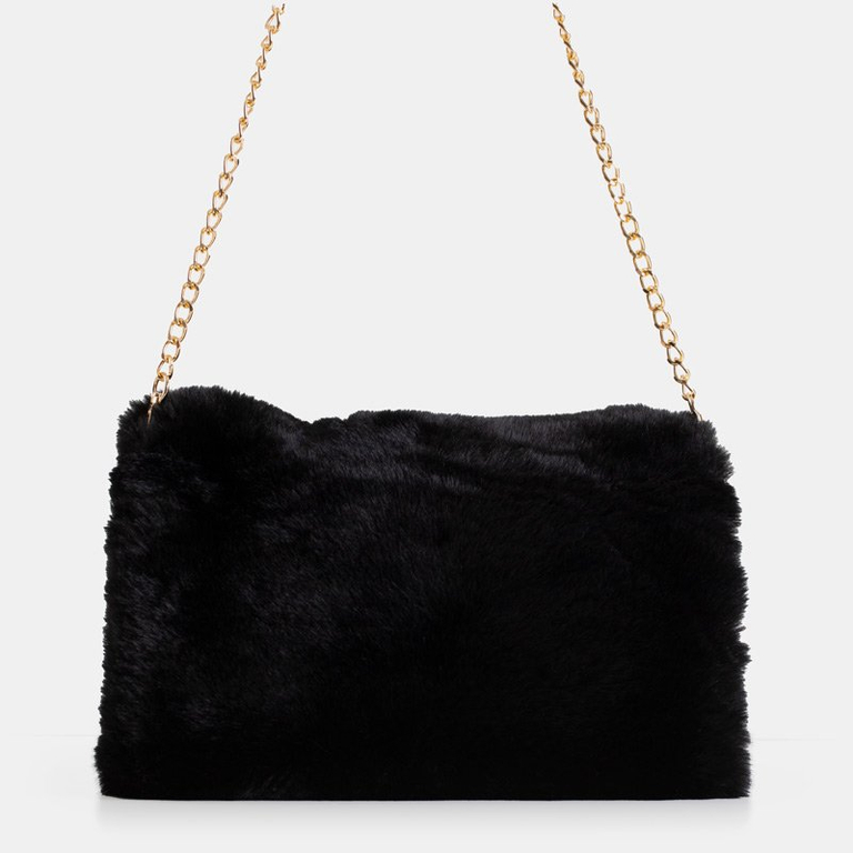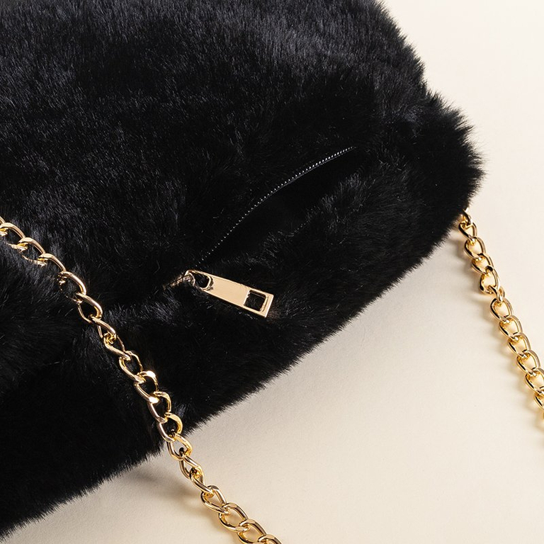 - Un sac à main doux pour femme fini en fourrure synthétique et fermé par une fermeture éclair. L'ensemble comprend une chaîne en or fermée par un fermoir mousqueton. Un compartiment à l'intérieur, pas de poches supplémentaires. Idéal pour les tenues de soi