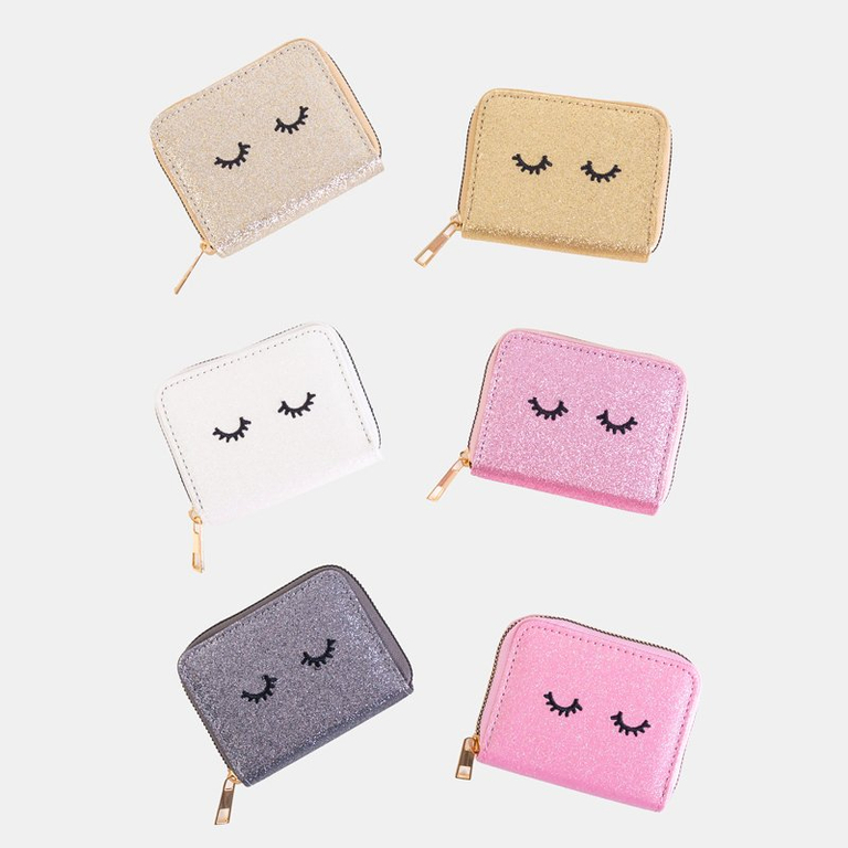 • Un joli portefeuille en cuir écologique avec une finition pailletée, décoré de cils brodés. Fermé par une fermeture éclair. Le modèle possède : - 1 compartiment pour les billets, - 4 poches pour les cartes.