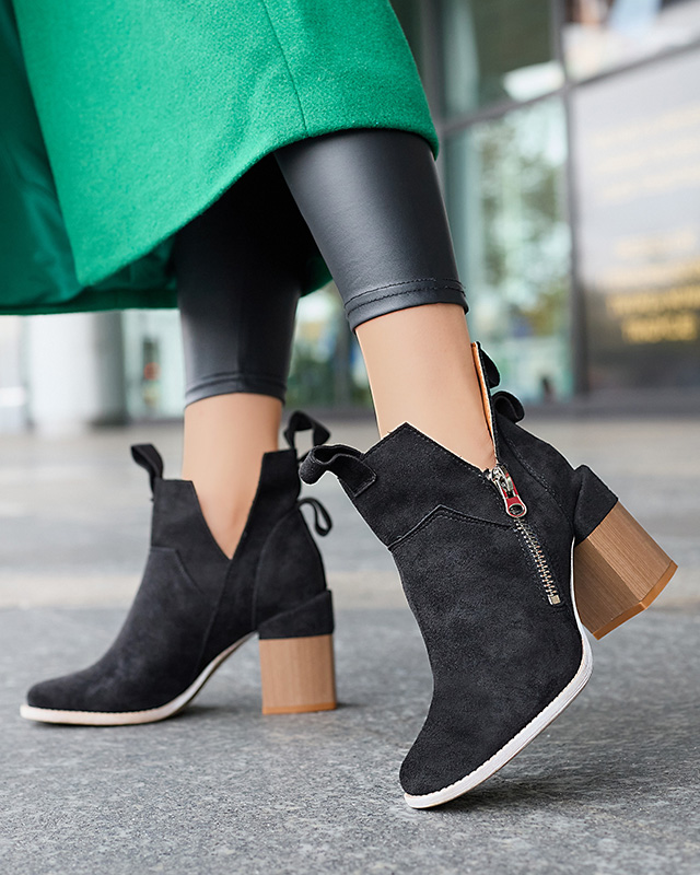 • Bottes femme uniques sur tige carrée avec bout rond. Le matériau est fait de cuir éco-suède, avec une semelle intérieure en éco-cuir à l'intérieur. La tige est zippée, le côté a des découpes. Des chaussures parfaites pour créer des tenues mode et original