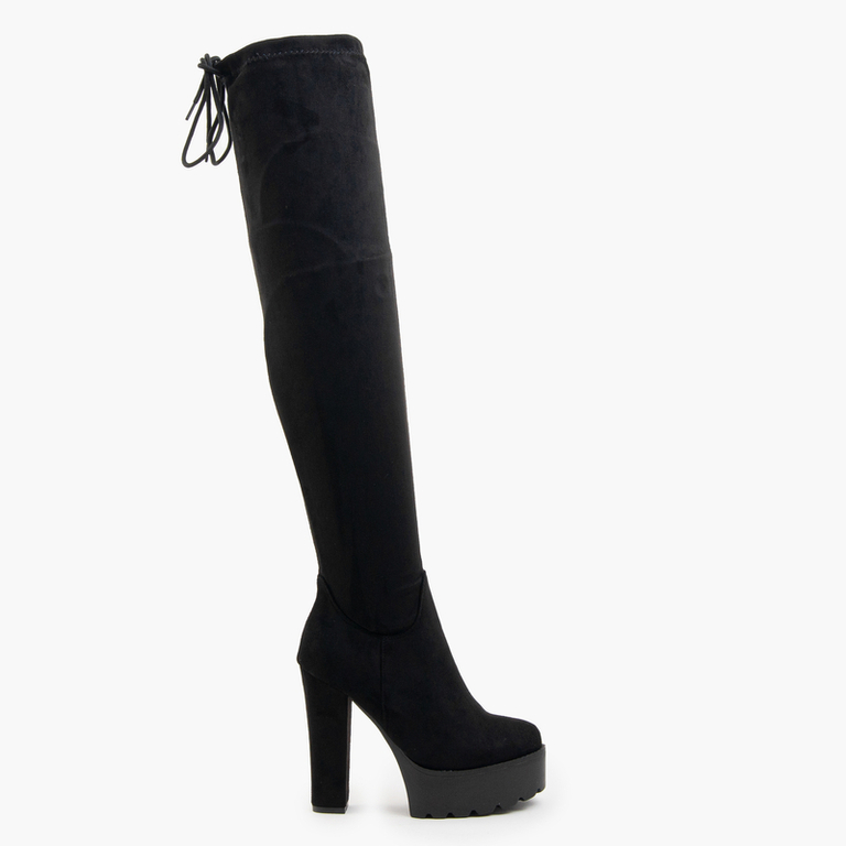 • Cuissardes élégantes avec tige haute et plateforme. La tige est en cuir éco-suède, fermée par une fermeture éclair sur le côté. Les bottes sont partiellement isolées avec de la fourrure au bas. Il y a un cordon de serrage à l'arrière qui permet d'ajuster