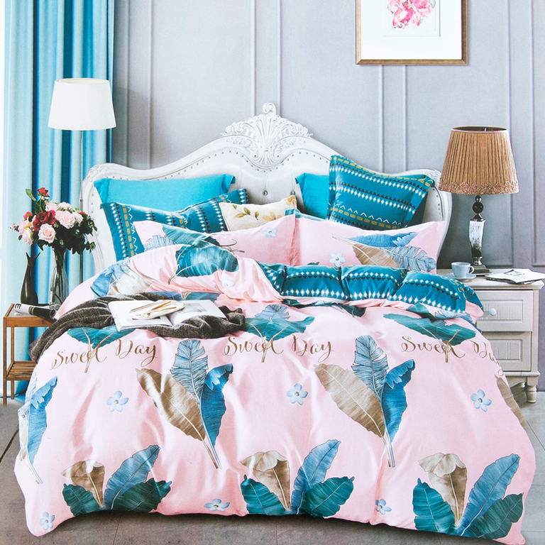 Parure de lit coton feuille rose 160x200 4 pièces - Linge de lit
