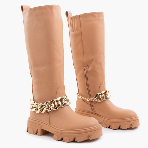 - Bottes classiques pour femmes à hauteur de genou en cuir écologique. A hauteur de cheville, le modèle est agrémenté d'une bandoulière amovible avec une chaîne en plastique de couleur dorée. Les chaussures sont fermées par une fermeture éclair, l'intérieur