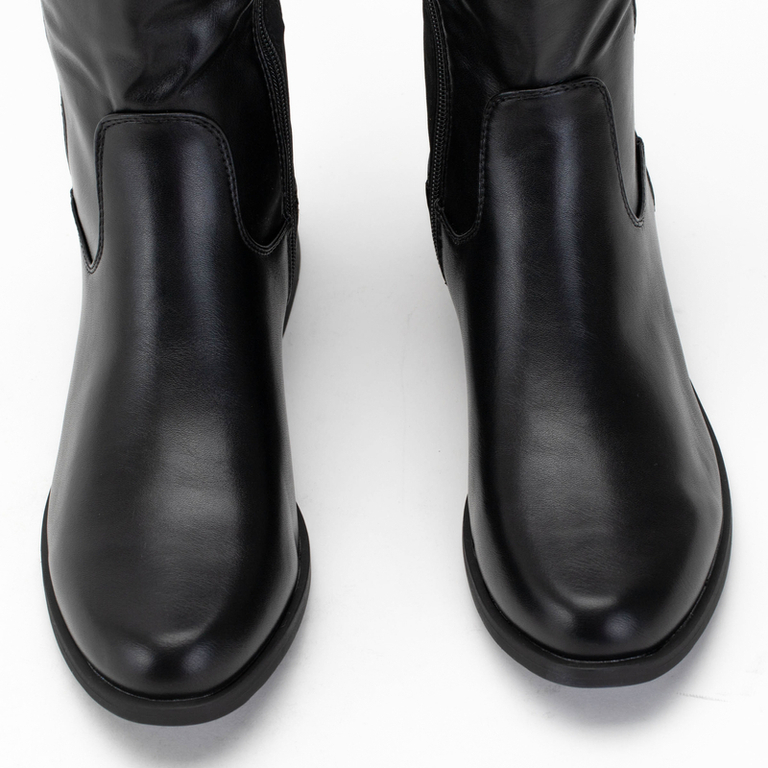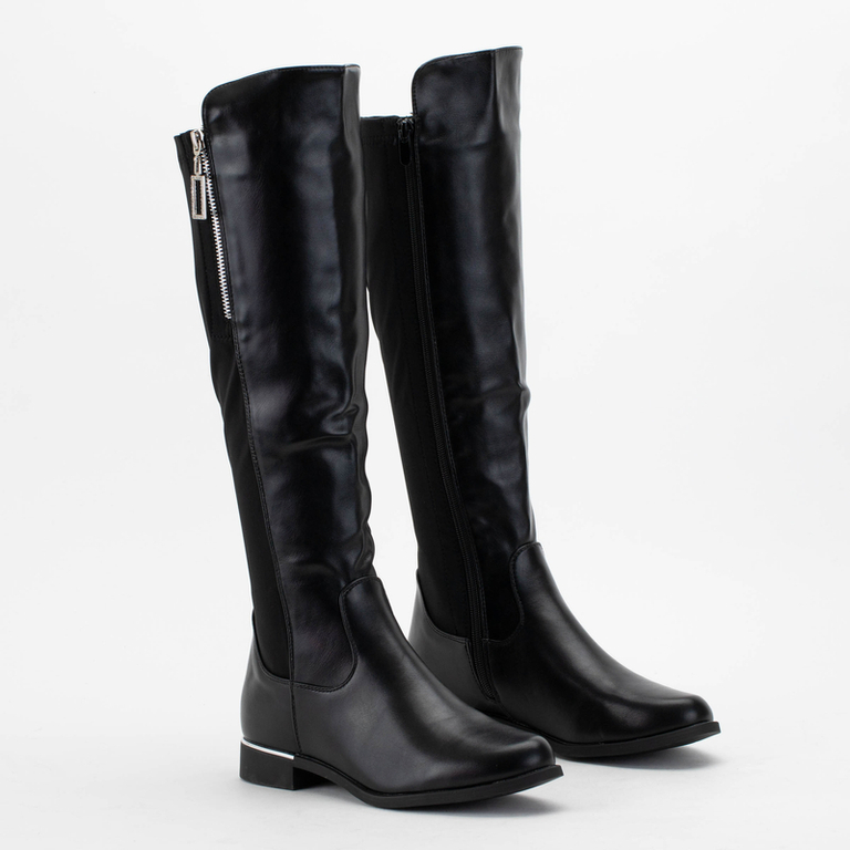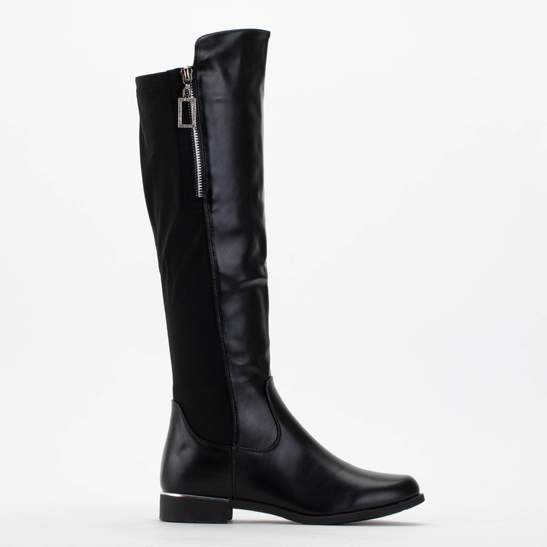 - Cuissardes noires en cuir écologique. L'arrière de la chaussure est en tissu élastique. Modèle isolé, zippé jusqu'au milieu du mollet. Chaussures plates. Classique et élégant !