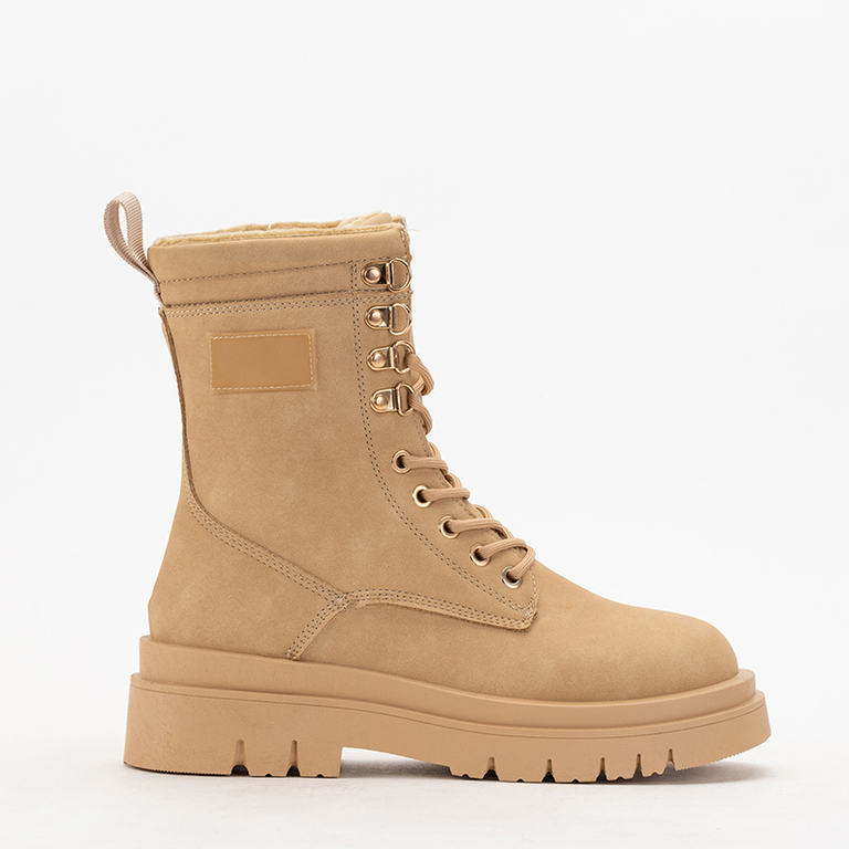 - Bottes à talons plats sensationnelles pour femmes en éco-cuir mat. Modèle avec tige à lacets. L'intérieur est isolé avec un matériau en fourrure. Parfait pour les jours plus froids.