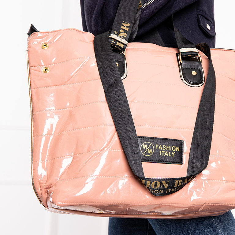 - Sac cabas matelassé élégant pour femmes en cuir verni et fermé par une fermeture éclair. Le modèle a : - 1 compartiment ; - 3 poches intérieures dont 2 poches plaquées et 1 poche zippée.
