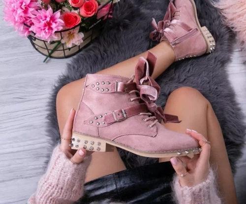 - Travailleurs roses à talons plats. Fermé par une fermeture éclair et lacé. La tige est en éco-suède. L'ajout de clous et d'arcs les rend uniques parmi les chaussures. Remarque : le produit présente des rayures sur le matériau.