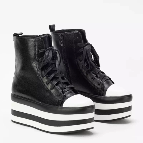 - Bottes pour femmes uniques sur une plate-forme haute, en cuir écologique. Le modèle est lacé et possède une fermeture zippée sur le côté, un insert en tissu au milieu. Remarque : le produit présente des traces de colle sur le matériau.