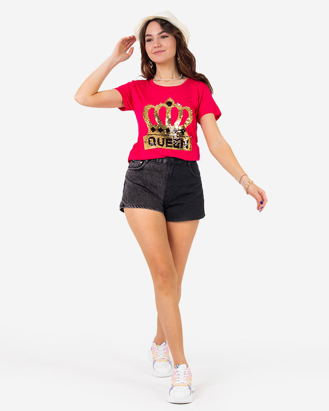 T-Shirt Femme Fuchsia avec Couronne et Paillettes - Vêtements