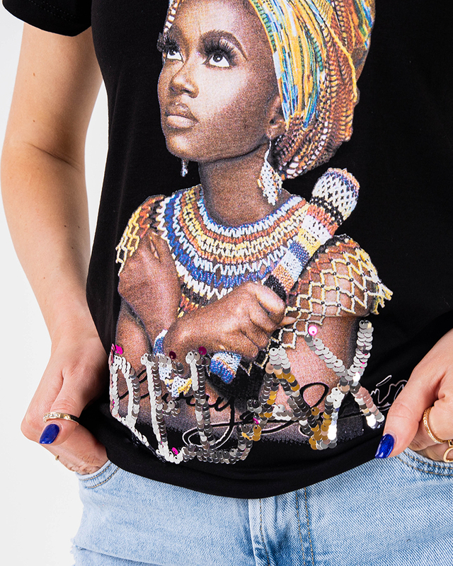 T-shirt femme noir imprimé coloré et sequins - Vêtements