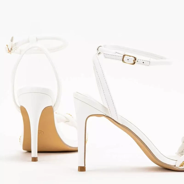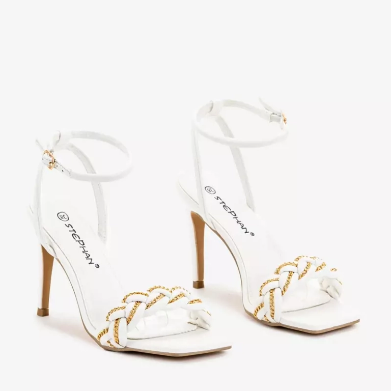 - Belles sandales pour femmes sur un talon haut, ornées d'une chaîne en or. La paire est entièrement réalisée en cuir écologique. Il y a une sangle réglable autour de la cheville fermée par une boucle. Remarque : le produit a du matériel cassé.