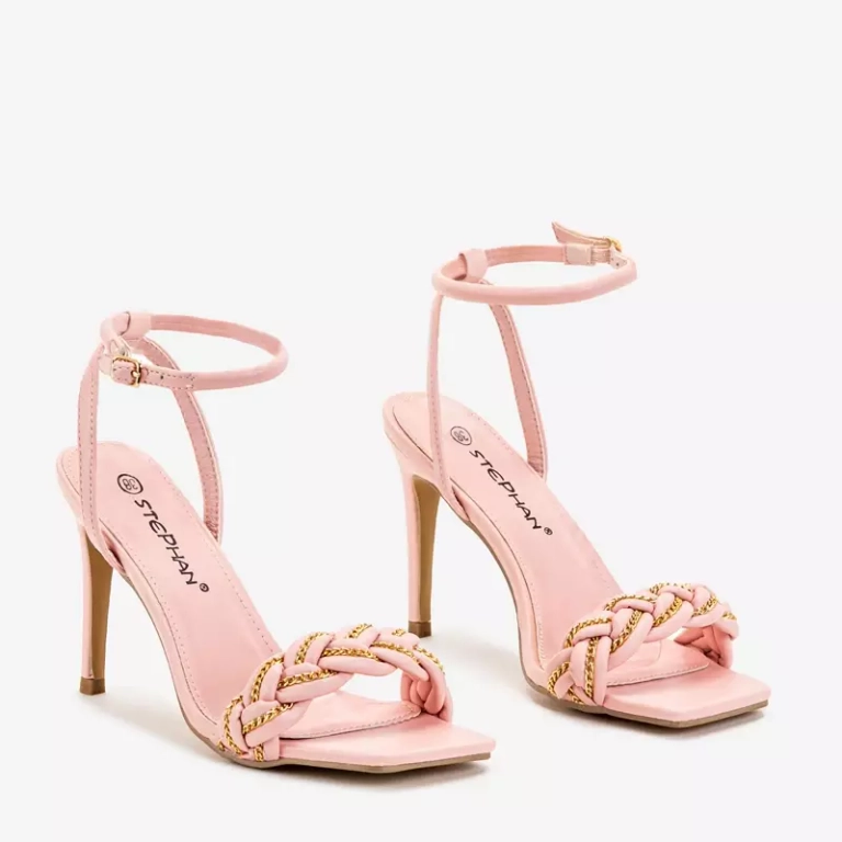 • Belles sandales pour femmes sur un talon haut, ornées d'une chaîne en or. La paire est entièrement réalisée en cuir écologique. Il y a une sangle réglable autour de la cheville fermée par une boucle. Remarque : le produit présente des rayures sur le matér