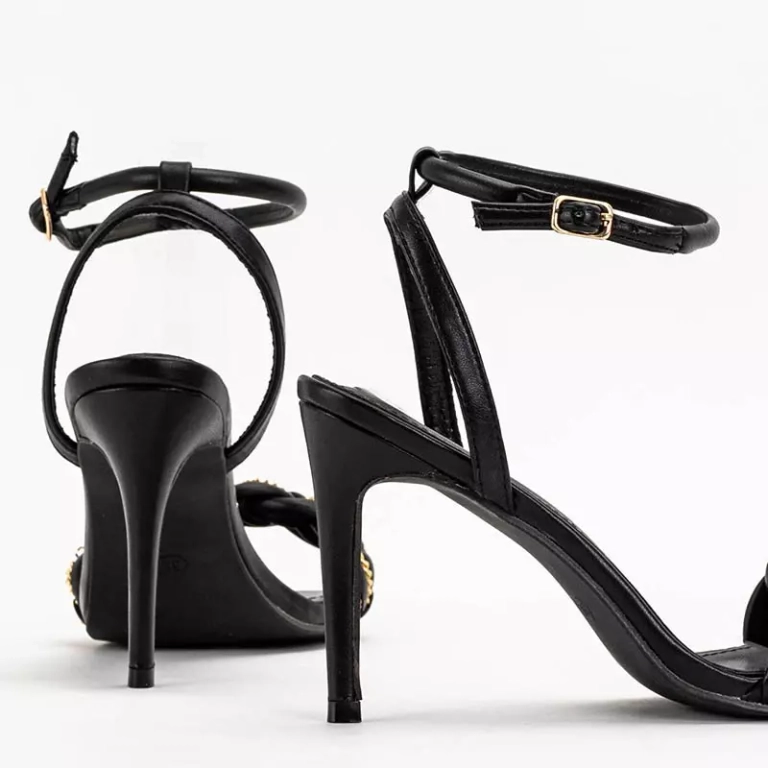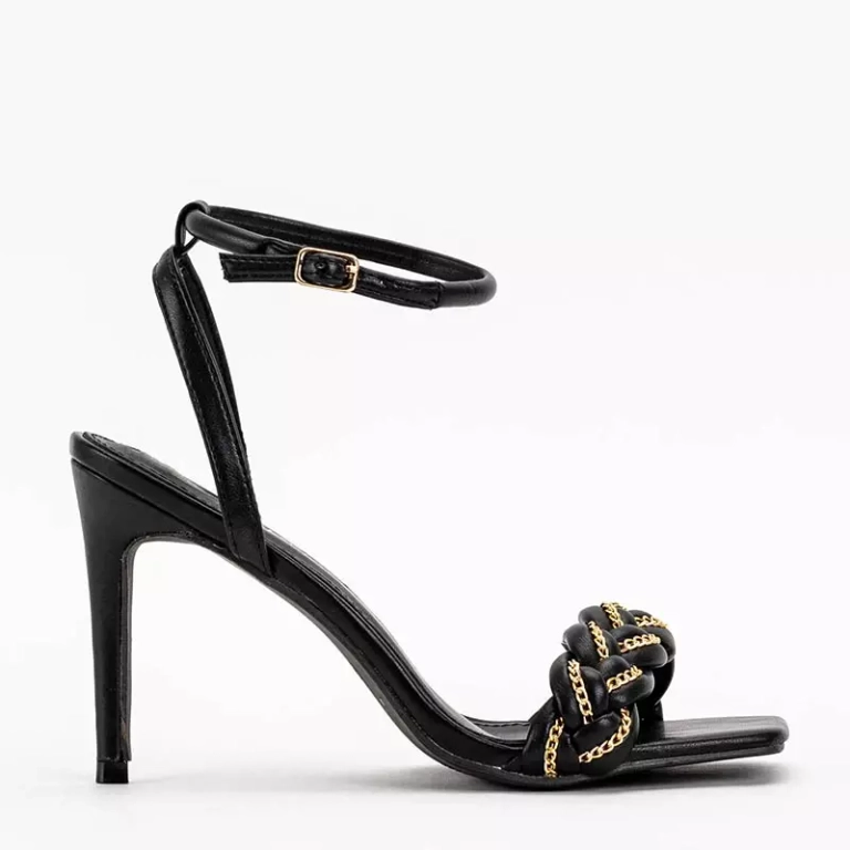 - Belles sandales pour femmes sur un talon haut, ornées d'une chaîne en or. La paire est entièrement réalisée en cuir écologique. Il y a une sangle réglable autour de la cheville fermée par une boucle. Remarque : le produit présente des rayures sur le matér