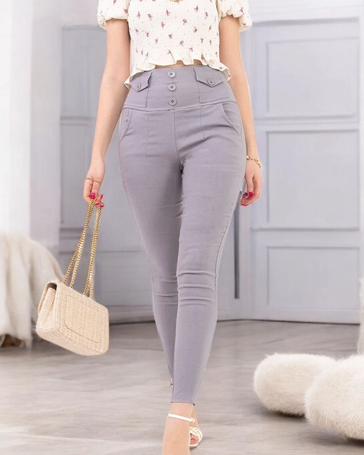 - Tregging femme taille haute en matière stretch. Le modèle a une taille élastique, des boutons décoratifs, 2 poches. REMARQUE : Précision de mesure (+/-) 1 cm.