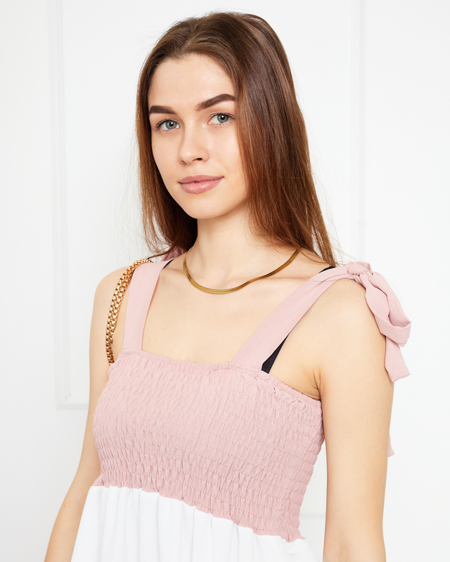 - Mini robe femme à bretelles nouées. Le modèle tricolore a une encolure droite et des volants. Parfait pour les jours d'été !
