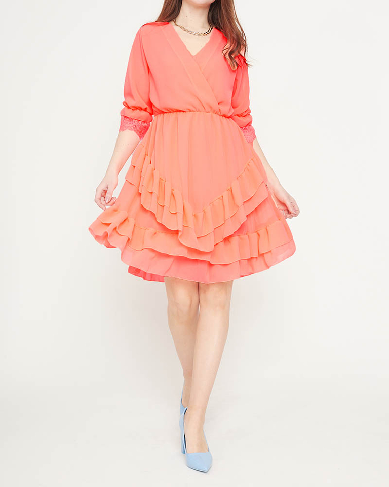 - Fantastique mini robe pour femme. Le modèle col V a des manches 3/4 terminées par de la dentelle. Robe d'été légère ornée de volants, dotée d'une doublure et d'un élastique cousu à la taille. REMARQUE : Précision de mesure (+/-) 1 cm.