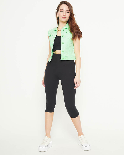 - Gilet en jean sans manches avec fermeture à boutons métalliques, col et deux poches à rabat sur le devant. REMARQUE : Précision de mesure (+/-) 1 cm.