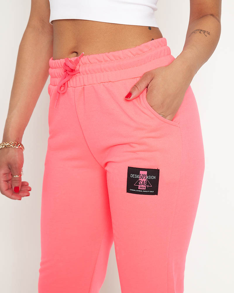 • Pantalon femme en tissu a'la survêtement, dans des couleurs uniques et audacieuses et un badge sur le côté droit. Modèle avec 2 poches plaquées, taille et bas de jambes élastiqués, cordons de serrage noués à la taille. REMARQUE : Précision de mesure (+/-)