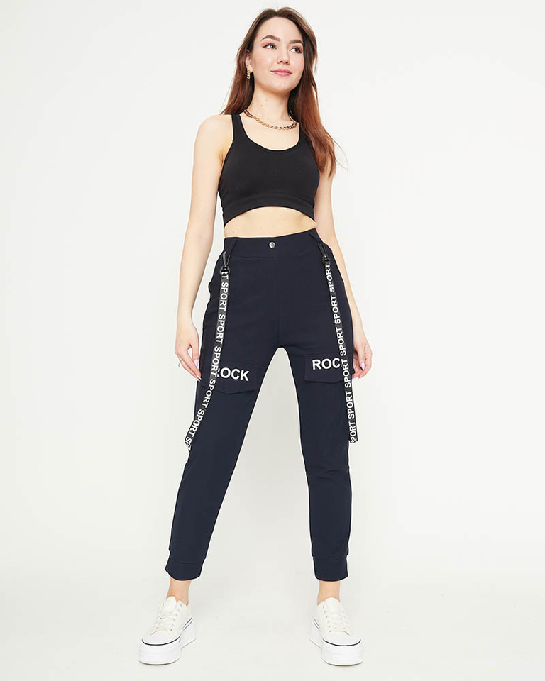 - Pantalon cargo femme unique en tissu élastique. Le modèle a une ceinture élastique, deux poches plaquées et deux décoratives avec des inscriptions. De plus, des bretelles décoratives sont attachées au pantalon. REMARQUE : Précision de mesure (+/-) 1 cm.