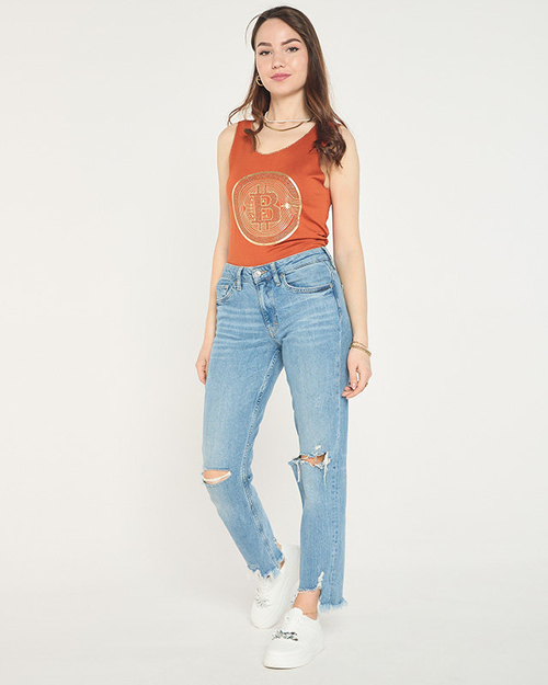 - Top femme avec bretelles en matière élastique. Impression dorée sur le devant. Encolure ronde. REMARQUE : Précision de mesure (+/-) 1 cm.