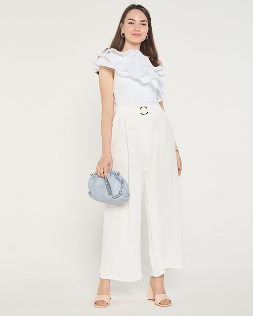 - Le pantalon palazzo large femme parfait. Le modèle taille haute est en tissu léger et aéré, possède une large ceinture élastique et un ornement en métal doré. Cette paire ajoutera du style à n'importe quelle tenue ! REMARQUE : Précision de mesure (+/-) 1